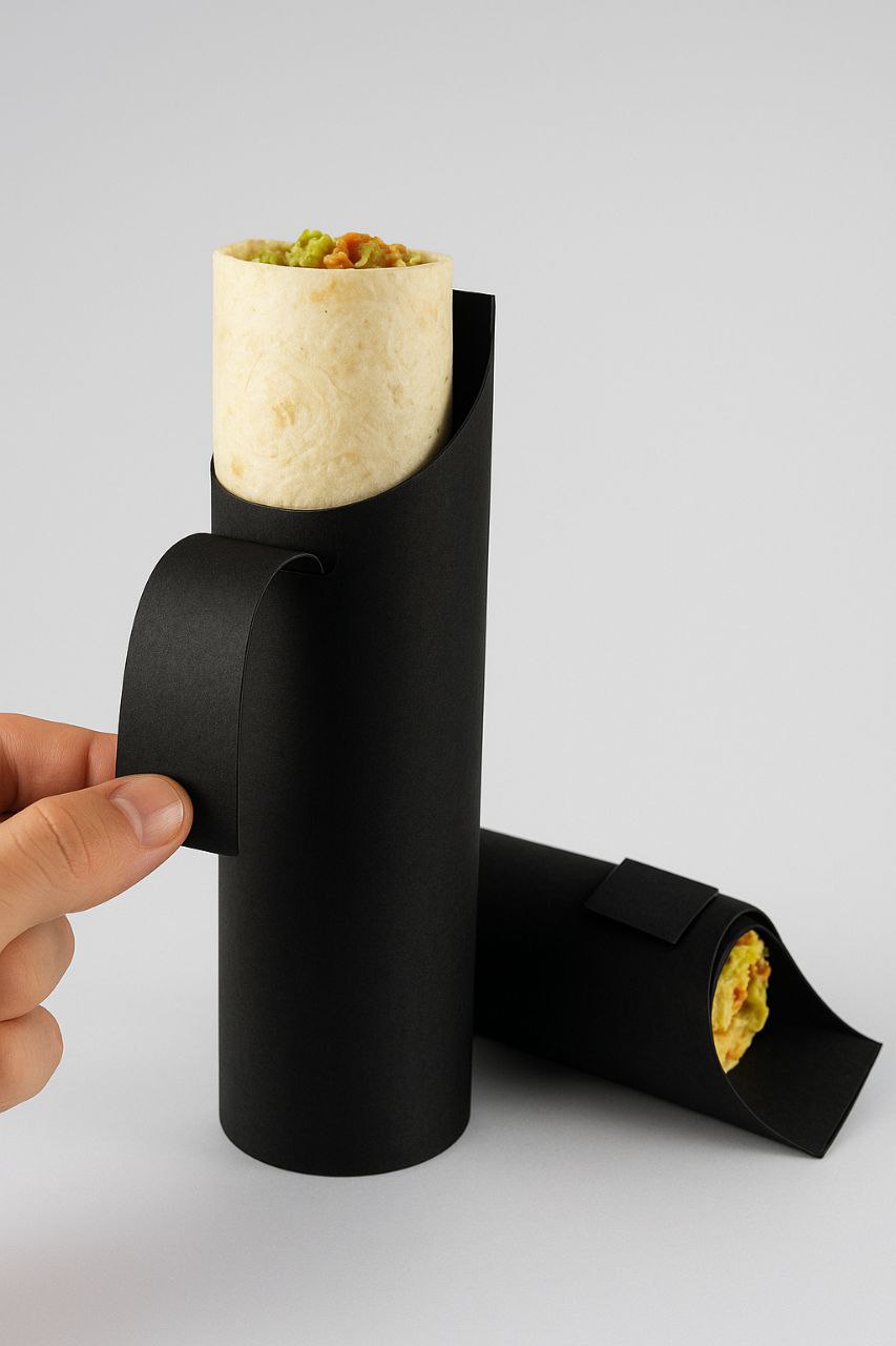 این بستهبندی شامل یک جعبه مقوایی مشکی مات برای قرار دادن ساندویچ/رپ است.
